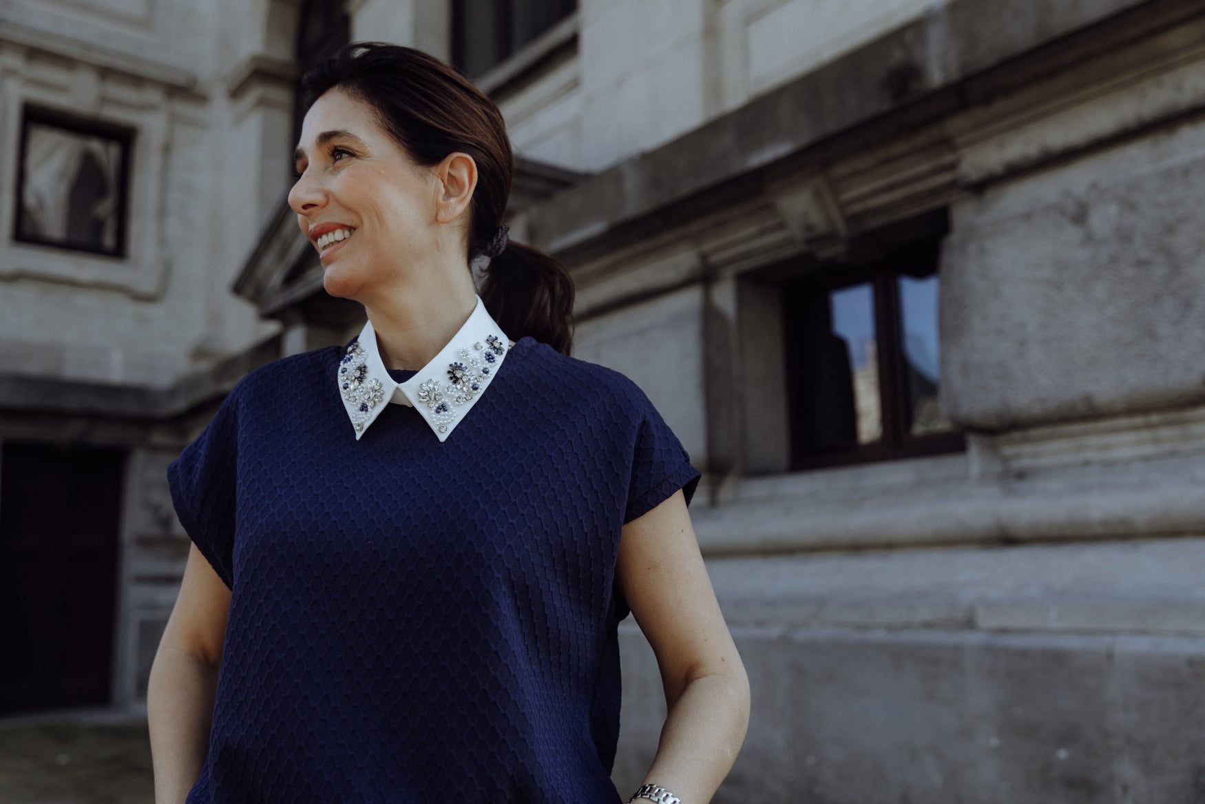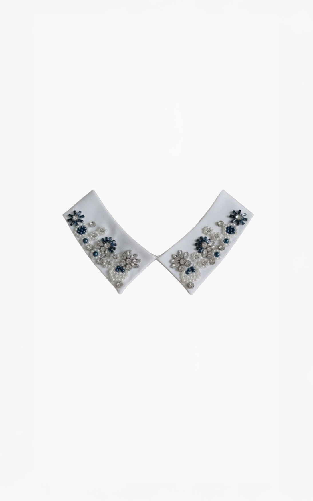 De Collar is een speelse en stijlvolle toevoeging aan je outfit. Het witte kraagje met blauwe en witte steentjes geeft een top of sweater direct een verfijnde en bijzondere uitstraling.